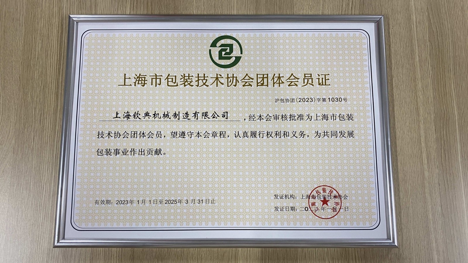 上海欽典機械獲得上海市包裝技術(shù)協(xié)會團(tuán)體會員證證書